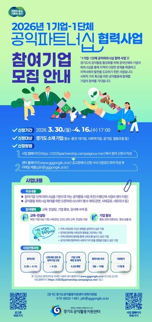 경기도공익활동지원센터는 경기도 내 기업과 공익단체 간의 전략적 파트너십을 통해 지역 공익활동을 활성화하기 위한 ‘2026년 1기업-1단체 공익파트너십 협력사업’에 참여할 기업을 4월 16일 오후 5시까지 모집한다.이번 사업은 기업의 사회적 책임(CSR) 활동과 공익단체의 현장 전문성을 결합해 기후환경, 자원순환, 공동체·돌봄, 다문화·이주민 등 지역사회의 다양한 문제를 해결하고, 지속 가능한 협력 모델을 구축하기 위해 마련됐다.모집 대상은 경기도에 소재한 기업으로, 규모나 유형에 상관없이 누구나 참여할 수 있다. 사업 누리집을 통한