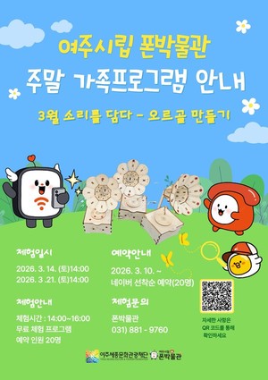 여주세종문화관광재단 여주시립 폰박물관은 2026년 3월부터 11월까지 매월 주말 가족체험 프로그램을 운영하며, 3월 체험 프로그램 「소리를 담다 – 오르골 만들기」 참여자를 모집한다.이번 프로그램은 소리의 원리와 통신의 역사를 쉽고 재미있게 이해할 수 있도록 기획된 체험형 교육으로, 나만의 오르골을 직접 만들어보며 소리가 만들어지고 전달되는 과정을 자연스럽게 배울 수 있도록 구성하였다. 가족이 함께 협력하여 작품을 완성하는 과정 속에서 소통과 공감의 의미도 되새길 수 있을 것으로 기대된다.체험은 2026년 3월 14일(토)과 3월