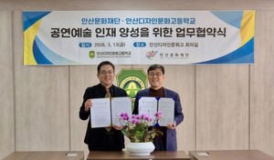 안산문화재단(대표이사 김태훈)은 2026년 3월 13일(금), 안산디자인문화고등학교(교장 김영배) 공연콘텐츠과와 “공연예술 인재 양성”을 위한 업무협약(MOU)을 체결했다.이번 협약은 안산문화재단이 지향하는 “문화예술을 통한 지역사회 상생 모델”의 일환으로 추진했다. 양 기관은 미래의 공연예술인을 꿈꾸는 학생들에게 전문적인 문화예술 교육을 접목함으로써 교육 현장에 창의적 에너지를 불어넣고, 지역과 함께 호흡하는 지속 가능한 문화 생태계를 구축하는 데 목적을 두고 있다.협약 주요 내용은 ▲문화예술 진로 탐색 및 인재 발굴을 위한 교육