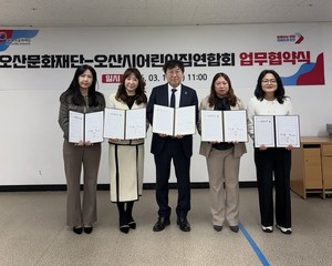(재)오산문화재단(대표이사 서정욱)과 오산시어린이집연합회(지회장 겸 국공립분과 회장 박은희)는 지난 19일 오산문화재단 회의실에서 지역 영유아를 위한 맞춤형 문화예술 프로그램 확대와 협력체계 구축을 위한 업무협약(MOU)을 체결했다고 밝혔다.이번 협약은 영유아 눈높이에 맞춘 문화예술 콘텐츠를 체계적으로 제공하고, 지역 기반의 문화예술 교육 환경을 강화하기 위해 추진됐다. 양 기관은 ▲영·유아 대상 맞춤형 공연 프로그램 기획·운영 및 참여 기회 제공 ▲오산문화재단 기획공연·전시·행사 관련 홍보 및 정보 공유 ▲어린이집 교직원 대상 공