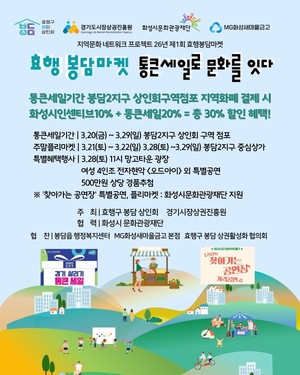 화성시문화관광재단(대표이사 안필연)은 효행구봉담상인회와 협력하여 ‘2026년 제1회 효행봉담마켓’을 오는 3월 28일(토) 봉담망고타운 광장에서 개최한다고 밝혔다.이번 행사는 효행구봉담상인회에서 주최하는 지역상권 활성화를 위한 행사이다. 재단은 ‘화성시 생활시장화인’ 시민운영자와 함께 수공예 아트마켓을 운영하고, ‘찾아가는 공연장’ 공연 개최를 통한 문화자원 협력으로 시민들에게 다양한 문화 향유 기회를 제공할 예정이다.행사는 오전 10시 30분 개막을 시작으로 11시 찾아가는 공연장 공연이 진행되며, 12시에는 봉담상인회에서 준비한